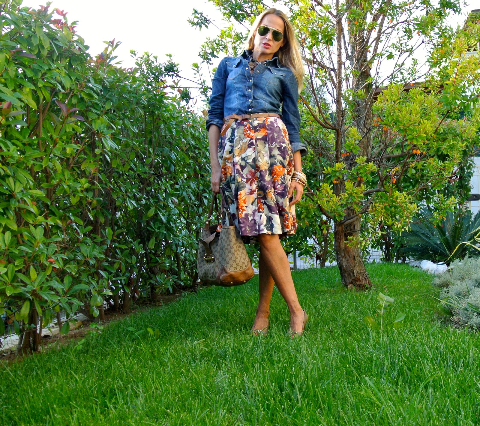 Ciao a tutti e buona Domenica!!! Le giornate sono ancora calde e ti permettono di alleggerire il guardaroba. Oggi ho abbinato qualche pezzo qua e la ripescato nell'armadio, una gonna vintage stampa floreale che adoravo e che avevo comprato molti anni fa dai primi Zara nati in Italia, e l'ho sdrammatizzata con questa camicia jeans invecchiata di Compagnia Italiana. Mi piaceva il contrasto del bucolico con la ruvidezza della tela denim, abbinandolo ad un tocco femminile dato dalla scarpa con plateau che negli ultimi tempi avevo abbandonato nella scarpiera senza dargli la possibilità di uscire allo scoperto....